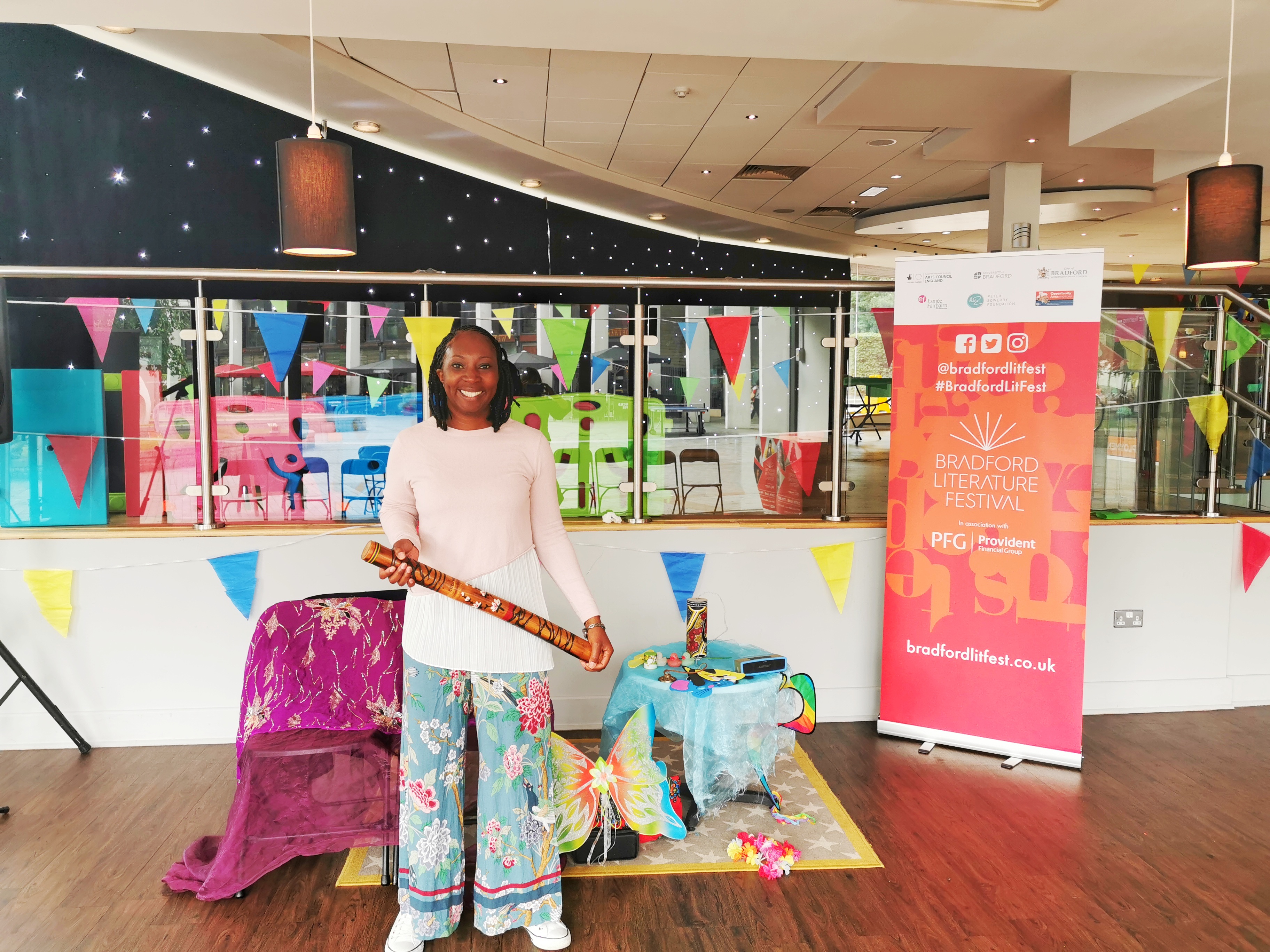 Bradford Literature Festival By Wendy ShearerJuly 8, 2019September 16, 2019Festivals, Past Events, Storytelling Wendy was thrilled to be one of the Storytellers at the Bradford Literature Festival along with a diverse array of authors and poets. A child participating & jumping into the woodland story with Wendy. Setting up for Day 2 at the Bradford Literature Festival Setting up for storytelling at the Bradford Literature Festival. City Hall Green Room The Green Room – filled with books, stories, storytellers and authors! Inside Bradford City Hall City Hall’s staircase.