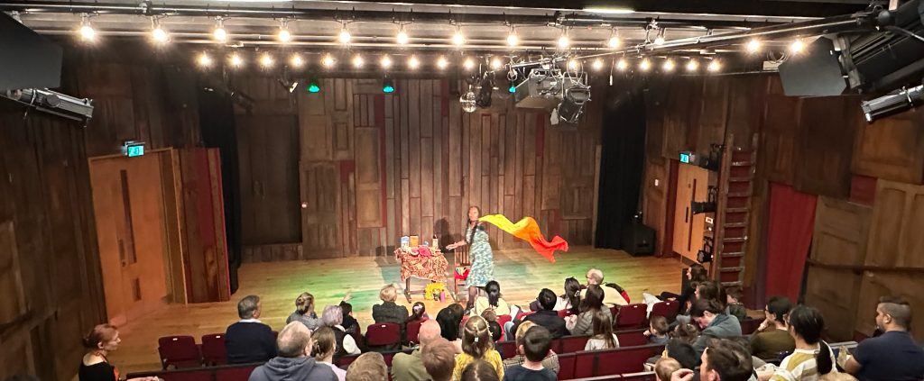 The Woodhouse theatre at the Story Museum in Oxford is an amazing space and their team assisted with lighting and music to help me create those rainforest sounds. We had an immersive session with my colourful props and percussion instruments.
